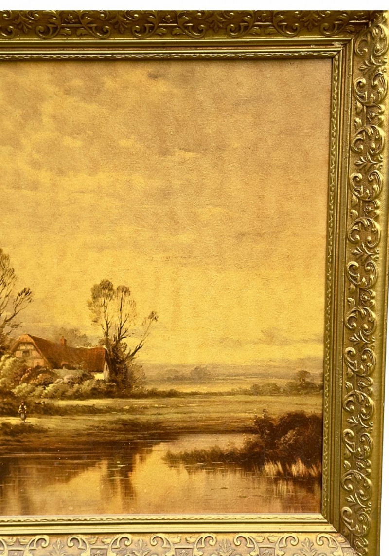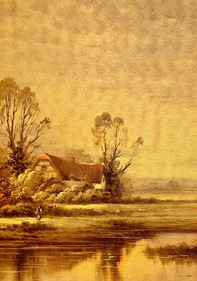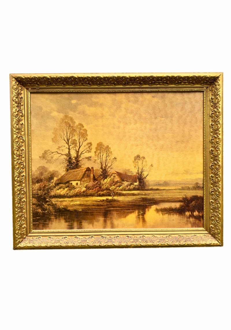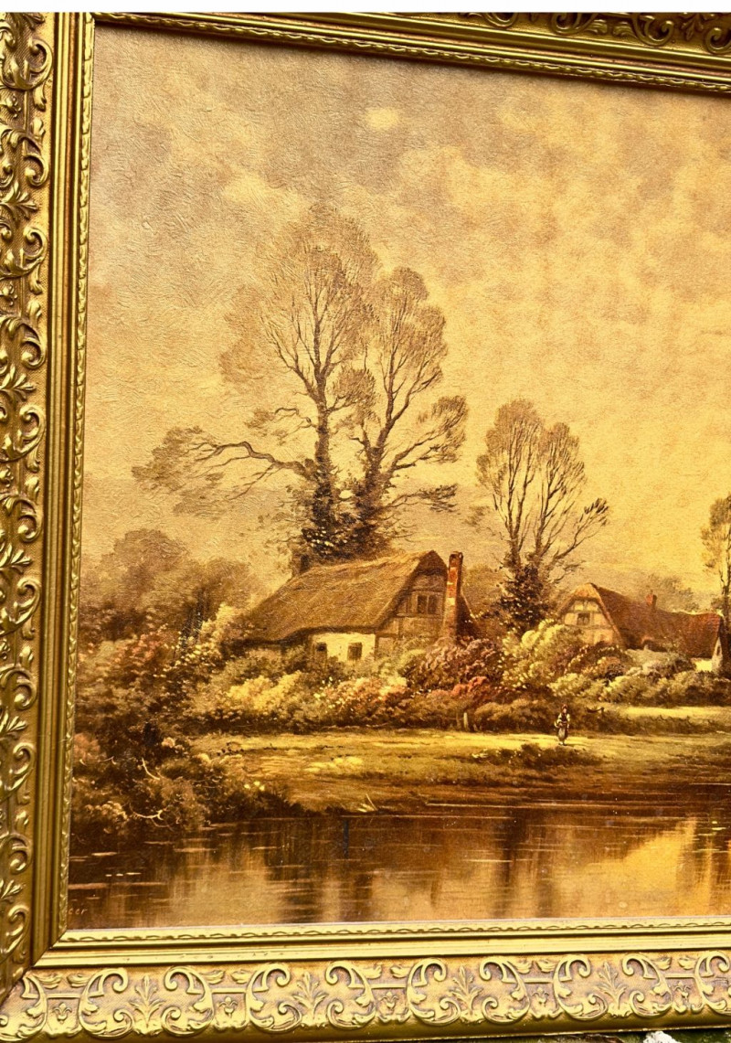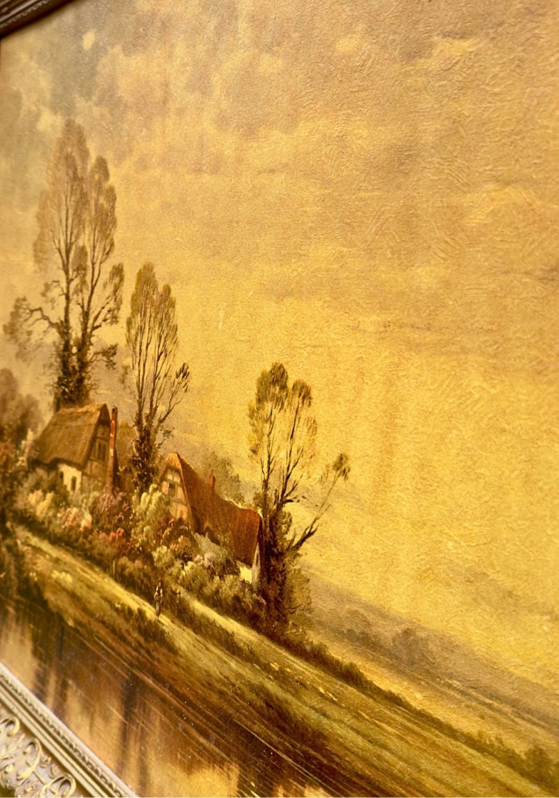 Large Framed Landscape Painting — “An Evening in Devonshire” (Attributed) This large framed landscape painting depicts a tranquil pastoral scene titled “An Evening in Devonshire,” showing cottages nestled among trees beside still water at dusk. The composition, palette, and atmospheric handling are consistent with late 19th to early 20th century British romantic landscape painting, with strong visual ties to works attributed to Augustus Spencer, a British artist known for serene rural scenes. While the artwork is not conclusively signed, digital image recognition has suggested a possible signature in the lower right area; however, no clearly legible signature is visible upon direct inspection. For this reason, the piece is offered attributed, rather than definitively credited, allowing buyers to evaluate based on quality, subject, and stylistic merit. The painting is housed in an ornate gilt frame with decorative scrolling and floral detailing, which complements the period aesthetic and adds strong visual presence. Due to its scale and classic subject matter, this piece works well as a statement artwork in traditional, European, or collected interiors. Title: An Evening in Devonshire Approximate Measurements: Measurements are approximate and provided for reference. Condition: Attribution Note: Value Context: