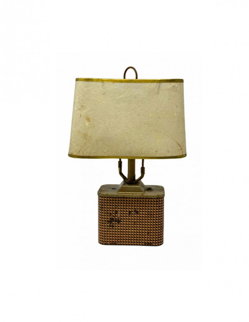 Good vintage condition with visible age and wear consistent with its era. The fiberglass shade shows discoloration, spotting, and areas of paint residue. The base exhibits patina, surface wear, and minor marks from age and use. The lamp has not been tested, and electrical functionality is not guaranteed. No major structural damage observed. Please review photos closely for condition details.
