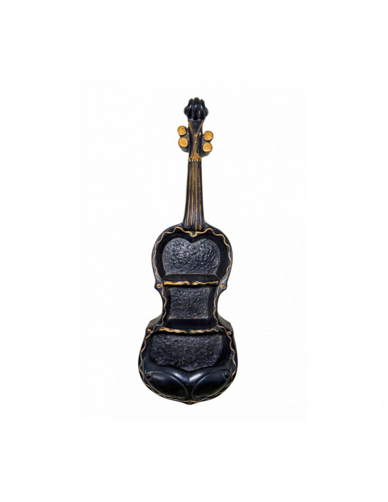 Vintage 1950s Chalkware Violin-Shaped Wall Pocket — Black & Gold Mid-Century Wall Decor This vintage mid-century chalkware wall pocket is sculpted in the form of a violin, offering a whimsical yet graphic decorative accent rooted in 1950s design. The piece features a richly textured black body with raised detailing and hand-painted gold accents highlighting the strings, tuning pegs, and decorative contours. Designed to hang vertically, the violin form includes recessed pocket sections that can be used for dried florals, faux greenery, or displayed purely as sculptural wall art. Its bold silhouette and playful musical motif make it an ideal addition to mid-century, eclectic, or retro-inspired interiors. Type: Wall pocket / wall-mounted decorative object Approximate Measurements: Measurements are approximate and provided for reference. Condition: Historical Note: Value Context: