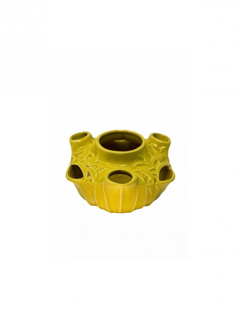 Vintage McCoy Yellow Embossed Art Pottery Floral Centerpiece Bowl This vintage American art pottery centerpiece bowl is attributed to McCoy and features a sculptural, multi-opening form with softly rounded contours and raised floral and foliate embossing throughout. Finished in a warm mustard-yellow glaze, the piece reflects classic mid-century design with organic detailing and decorative versatility. The bowl’s distinctive configuration includes a central vessel surrounded by multiple smaller openings, making it ideal for floral arrangements, candle display, or use as a statement decorative object. Its glossy glaze and dimensional relief work give it visual depth while maintaining the approachable charm McCoy pottery is known for. Type: Art pottery centerpiece / flower bowl Approximate Measurements: Measurements are approximate and provided for reference. Condition: Historical Note: Value Context:
