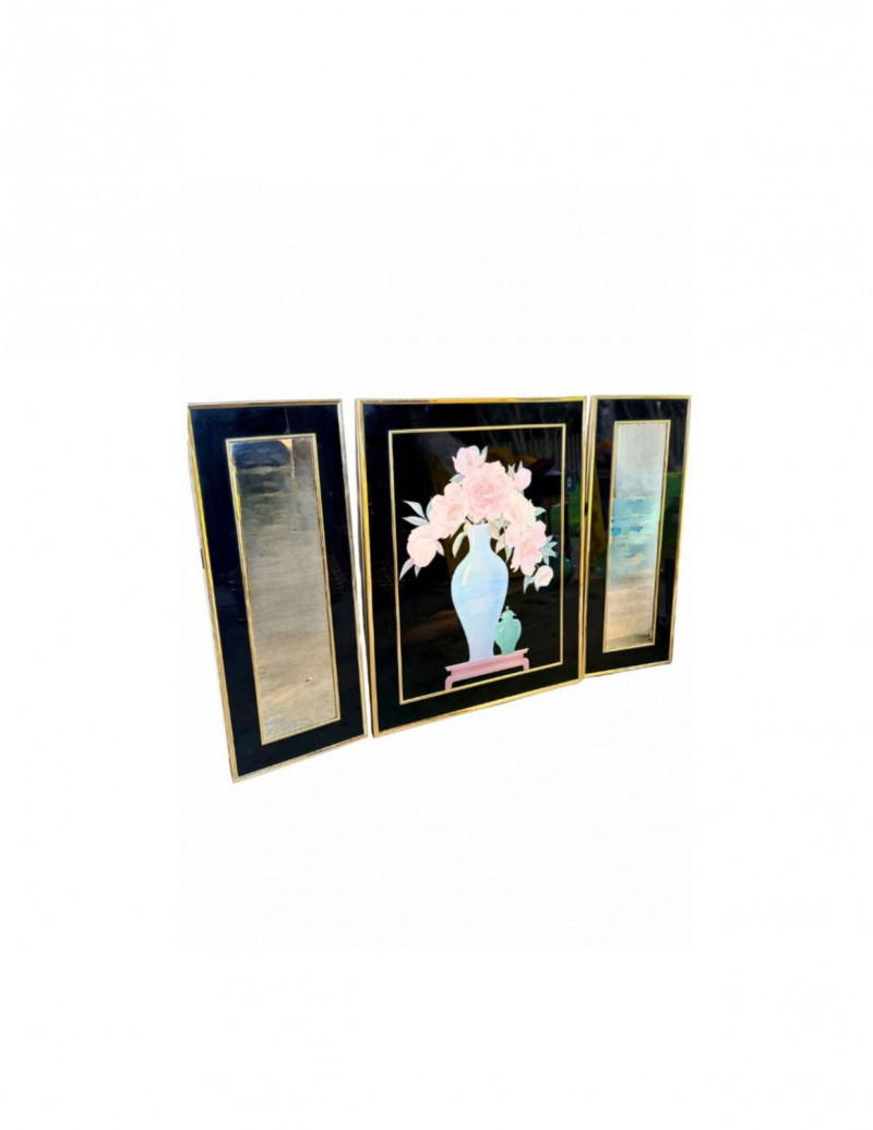 Vintage Floral Still Life Wall Art Triptych — Black Lacquer Panels with Mirrors This vintage three-piece wall art set features a central floral still life panel flanked by two coordinating mirrored panels, all set against a high-gloss black background with gold-tone trim. The composition creates a balanced triptych display that blends decorative art with functional reflection, making it ideal for statement wall styling. The center panel showcases a stylized floral arrangement in soft pastel tones, rendered with a refined, graphic quality typical of late 20th-century decorative wall art. The flanking mirror panels echo the same lacquered black ground and gold trim, framing the artwork and enhancing light and visual depth in a space. Together, the set offers strong visual symmetry and versatility—suitable for use above a console, sofa, dresser, or as an entryway focal point. Type: Wall art / mirror triptych Approximate Measurements: Measurements are approximate and provided for reference. Condition: Historical Note: Value Context: