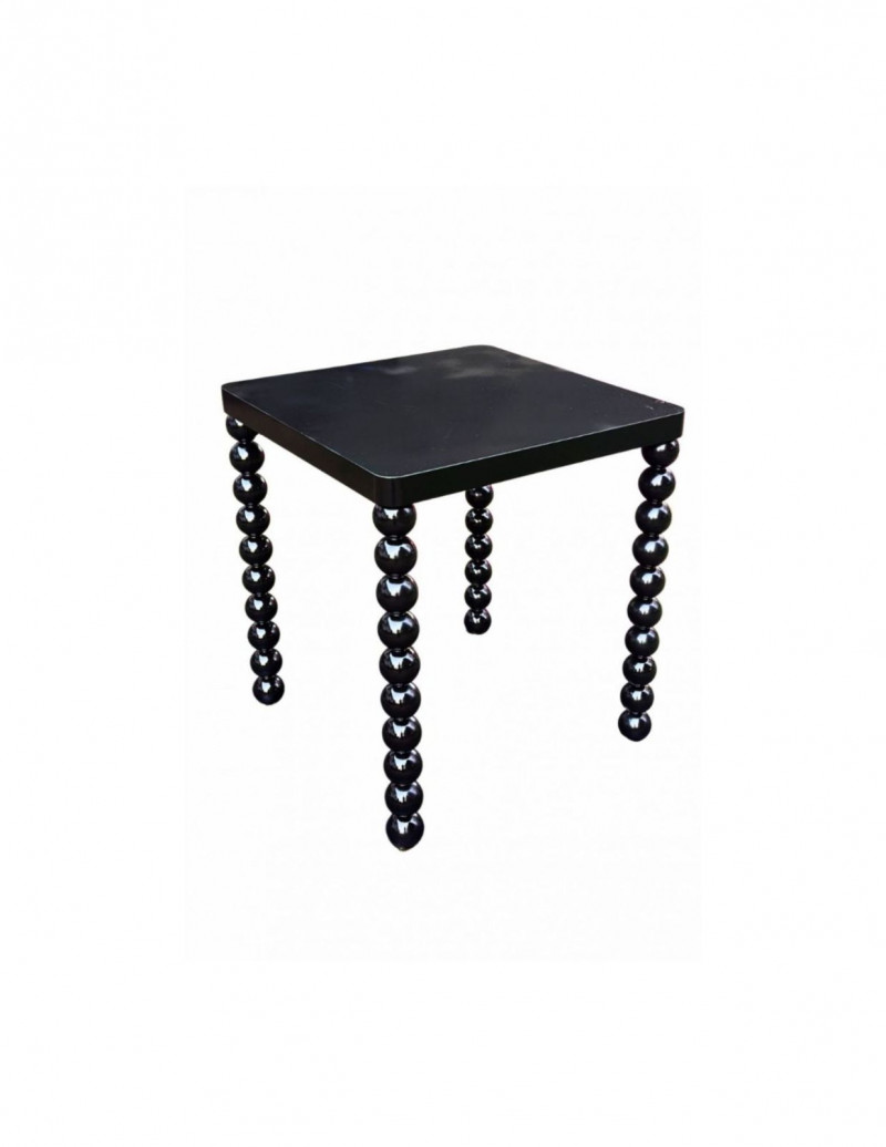 This sculptural side table features a square, black-finished top supported by four dramatic turned legs composed of stacked spherical forms. The bold silhouette blends playful geometry with clean modern lines, creating a statement piece that works equally well in contemporary, eclectic, or design-forward interiors. The exaggerated bead-style legs echo high-end European design aesthetics and are reminiscent of late-20th-century and early-21st-century sculptural furniture forms. While no maker’s mark is present, the design shows strong visual parallels to modern Italian furniture pieces, including tables produced by brands such as Flou and designs attributed to Rodolfo Dordoni, without direct attribution. Type: Side table / accent table Approximate Measurements: Measurements are approximate and provided for reference. Condition: Design Note: Value Context:Black Beaded-Leg Side Table — Sculptural Turned Legs, Modern Design Influence - very heavy, solid, and study