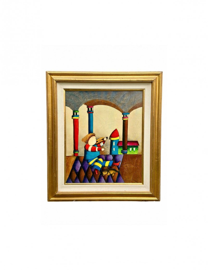 Large Whimsical Figurative Oil Painting in Gilt Frame — Roybal-Style, Unsigned This large, decorative oil painting features a whimsical figurative scene rendered in bold color, playful geometry, and thickly textured brushwork. The composition depicts a stylized figure playing a violin beneath a series of arched columns, with bright architectural elements and a patterned foreground that create a dreamlike, storybook atmosphere. The painting strongly resembles the distinctive style associated with Joyce Roybal, known for her childlike figures, vibrant palettes, and textured surfaces. While this piece is unsigned and cannot be definitively attributed, the visual language closely aligns with Roybal-influenced decorative art popular in the late 20th century. Presented in a substantial gilt wood frame with wide cream matting, this piece has significant wall presence and works beautifully as a statement artwork in a living room, entryway, or creative space. Type: Framed oil painting Approximate Measurements: Measurements are approximate and provided for reference. Condition: Attribution Note: Value Context: